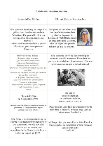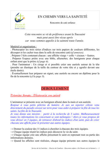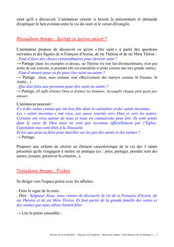 Dans cette rencontre caté simple à mettre en oeuvre, nous sommes invités à mettre nos pas dans les leurs et à nous engager à suivre leurs exemples : aimer Dieu et aimer les hommes pour devenir à notre tour des saints et des saintes de Dieu.
